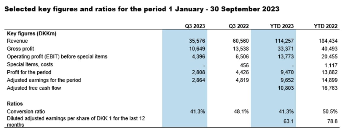 DSV affiche de solides résultats pour les neuf premiers mois de 2023. La marge brute baisse de 15,1 % et l'EBIT de 30,6 %, mais ce phénomène était attendu étand donné des conditions de marché difficiles et les bénéfices records réalisés l'année dernière.