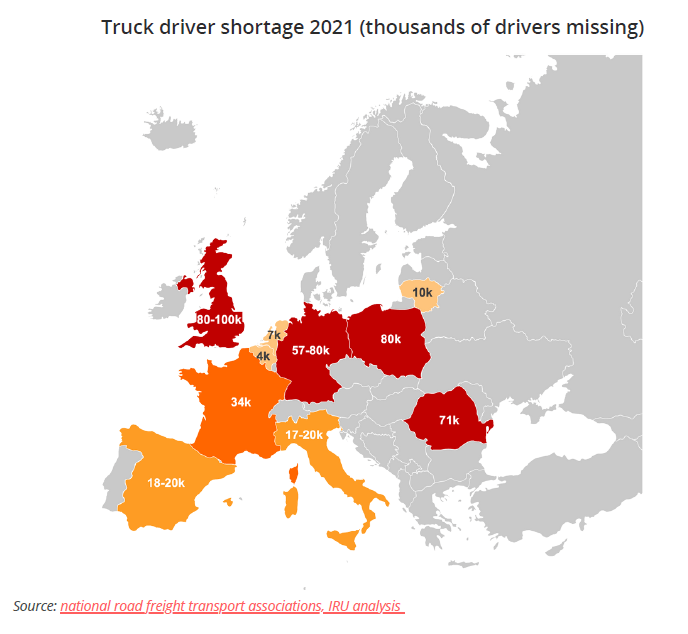 Det europeiske veifraktmarkedet har lenge hatt store utfordringer med arbeidskraft. Ved slutten av 2021, før krigen mellom Russland og Ukraina, var over 380,000-425,000 sjåførstillinger ledige i Europa estimert av IRU. Situasjonen har ytterligere presset som følge av krigen mellom Russland og Ukraina.